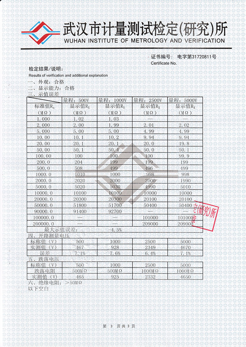 3、測試高壓為2500V,可測高達1 萬兆歐的絕緣電阻。