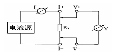 由電流源經(jīng)“I+、I-兩端口(也稱I型口),供給被測(cè)電阻Rx電流,電流的大小有電流表I讀出,Rx兩端的電壓降“V+、V-”兩端口(也稱V型口)取出,由電壓表V讀出。通過對(duì)I、V的測(cè)量,就可以算出被測(cè)電阻的阻值。
