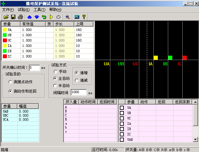 直流試驗(yàn)?zāi)K提供專(zhuān)門(mén)的直流電壓和電流輸出,主要是為了滿(mǎn)足做直流電壓繼電器、時(shí)間繼電器以及中間繼電器等試驗(yàn)的要求。直流模塊的主界面如圖所示: