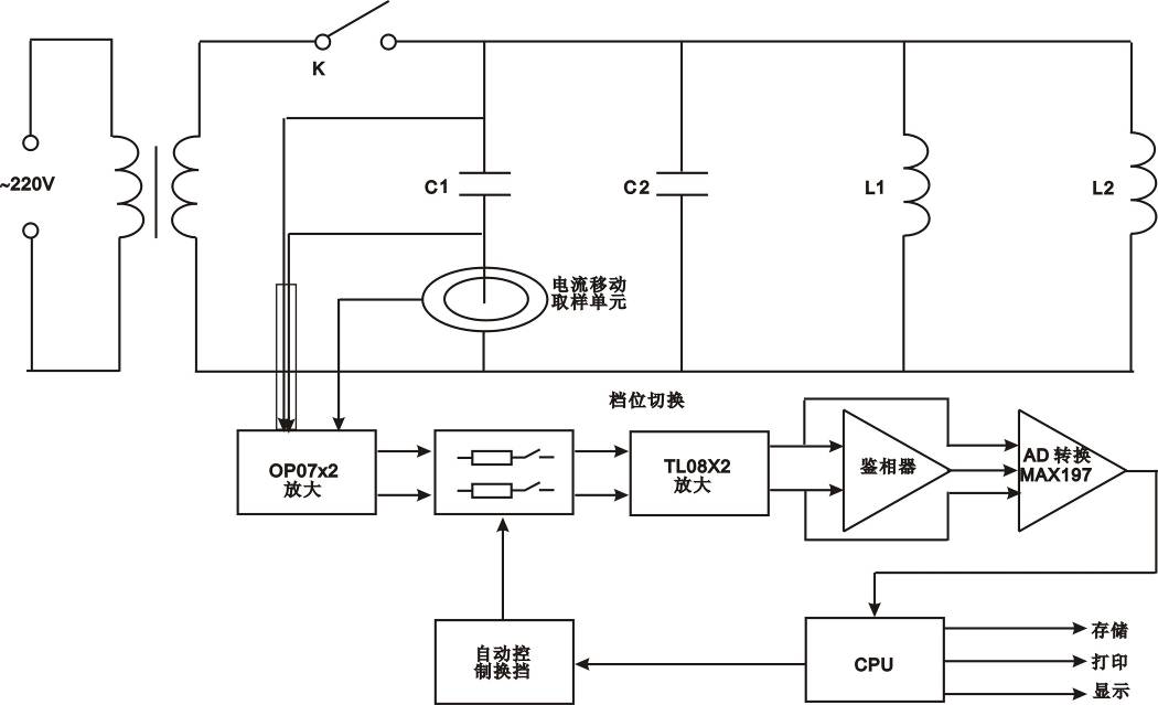 在被測電容支路有對被測電容的電壓、電流取樣的取樣電路,取樣電路的輸出端分別接放大電路,從電壓放大電路輸出的電壓信號和從電流放大電路輸出的電流信號通過鑒相器輸出相位差信號,與電壓信號和電流信號通過A/D轉換器后,輸入CPU計算而得到被測電容值。因為采用了移動的電流取樣單元,而使得無需拆除連接線就可以直接測量電容值。