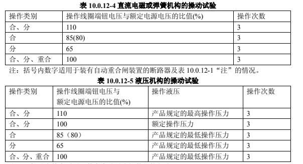直流電磁或彈簧機(jī)構(gòu)的操動試驗(yàn),應(yīng)按表 10.0.12-4 的規(guī)定進(jìn)行;液壓機(jī)構(gòu)的操動試驗(yàn),應(yīng)按表 10.0.12-5 的規(guī)定進(jìn)行。