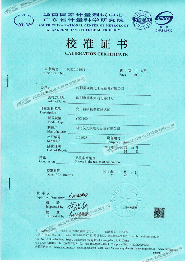 轉載:"YTC3100變壓器損耗參數測試儀的資質證書" 請注明來源于儀天成電力。 更多技術問題請致電儀天成電力客戶服務:027-87876585,技術部專線:027-87876585,在線客服:719388481