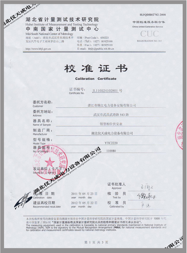 YTC2220數(shù)字雙鉗相位伏安表鑒定證書(shū)
