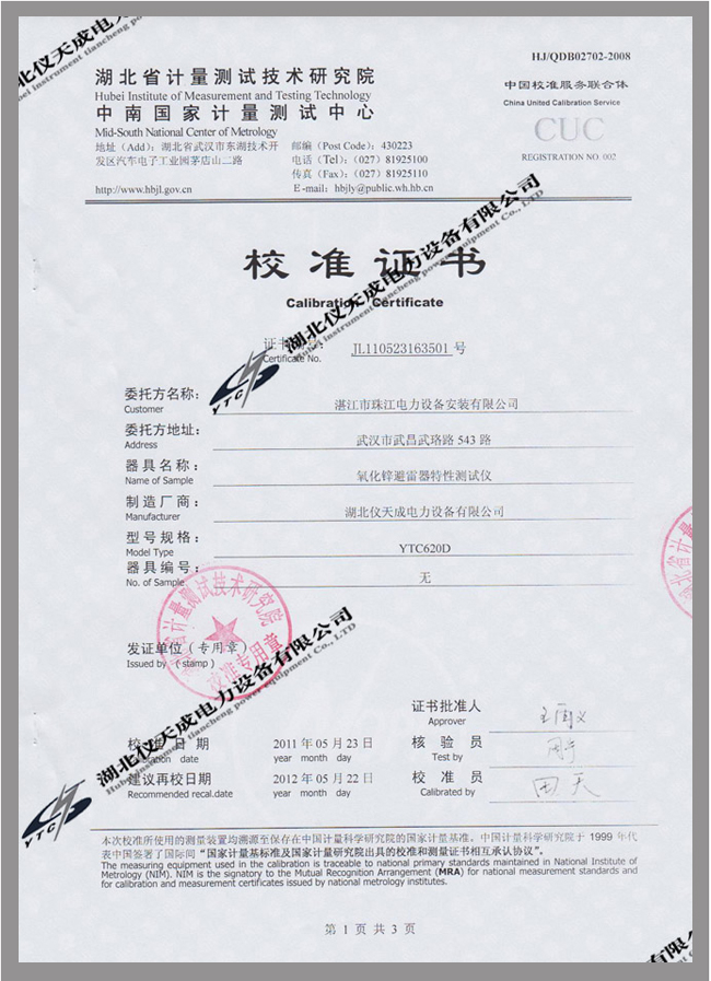 轉載:"氧化鋅避雷器特性測試儀鑒定證書" 請注明來源于儀天成電力。 更多技術問題請致電儀天成電力客戶服務:027-87876585,技術部專線:027-87876585,在線客服:719388481