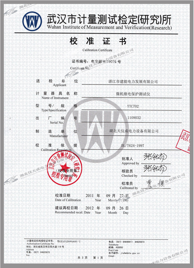 YTC702微機(jī)繼電保護(hù)測(cè)試儀鑒定證書